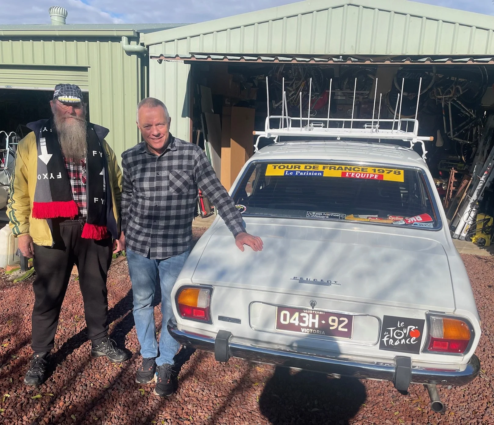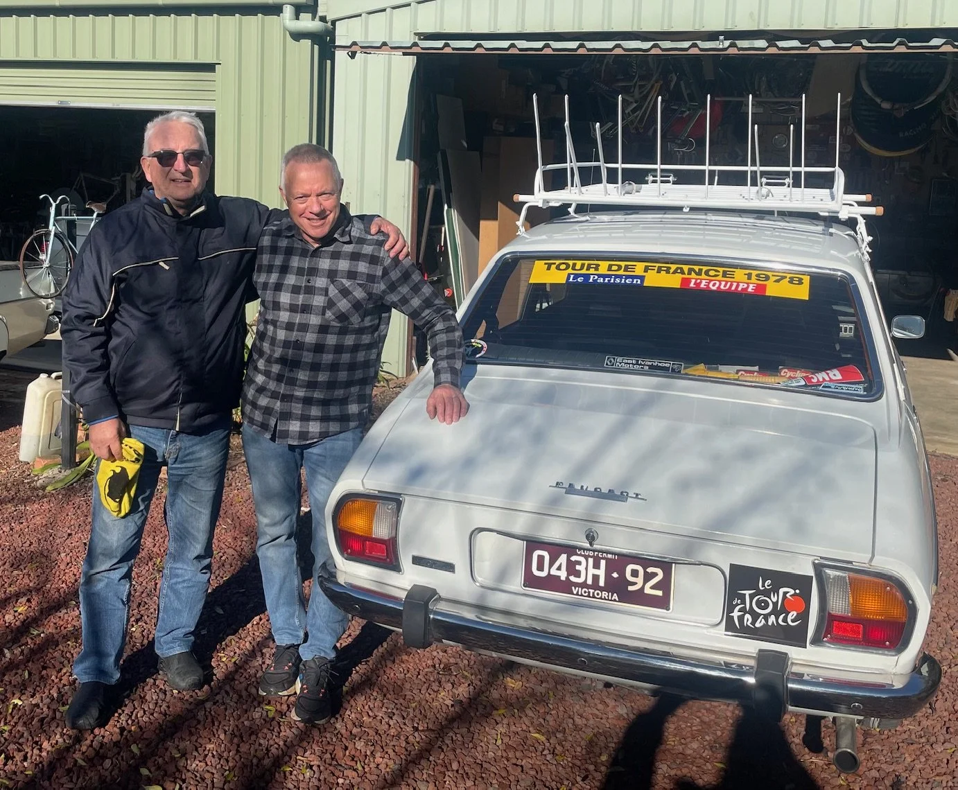 BiciSport @ 1 July @ Rutherglen Victoria - David Roggiero (left) and Greg Griffiths with the new (old) Tour de France Peugeot 504